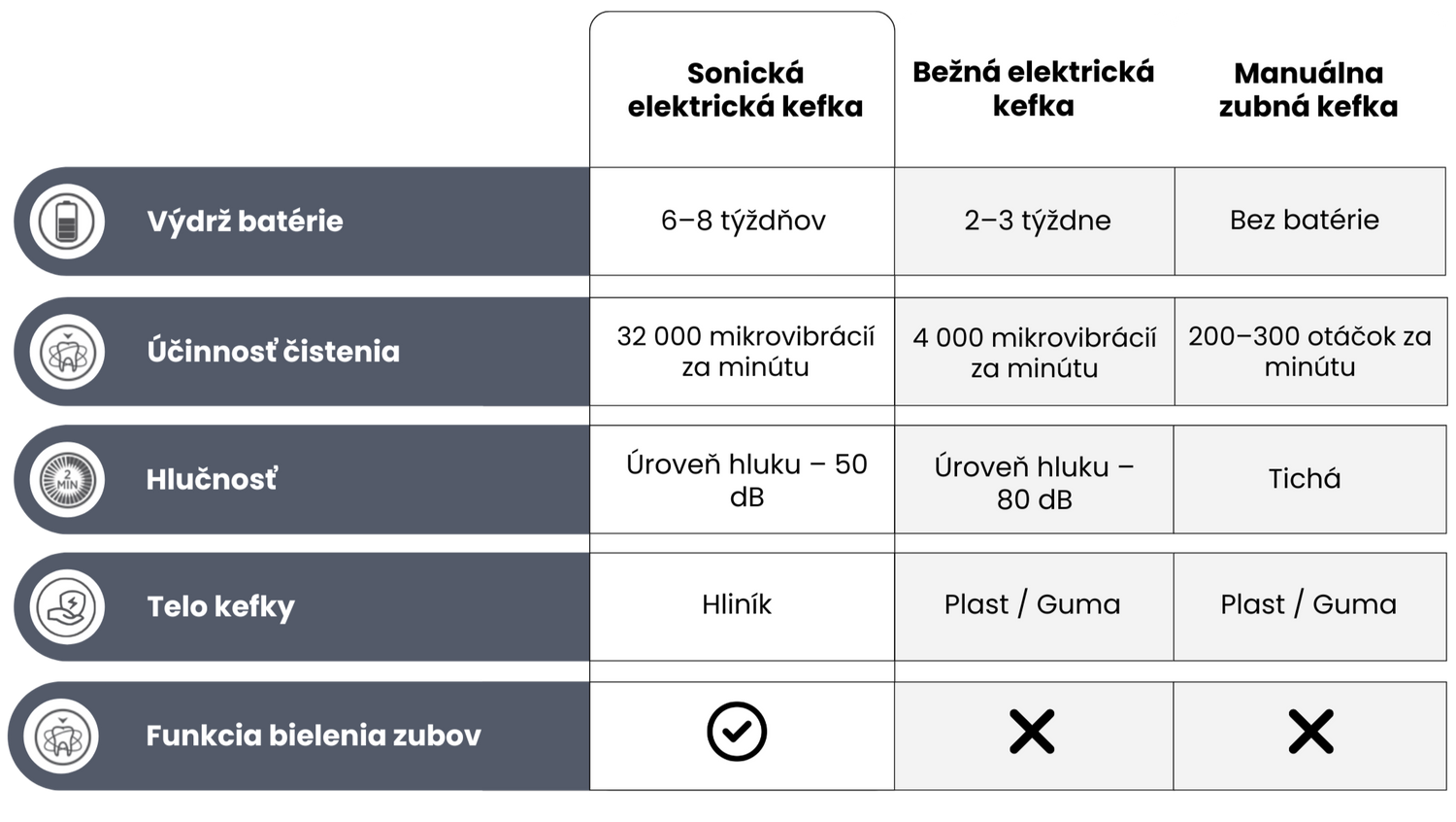 Na rozdiel od bežných elektrických zubných kefiek, sonické zubné kefky pracujú s mimoriadne vysokofrekvenčnými vibráciami, ktoré zabezpečujú vynikajúcu účinnosť čistenia.